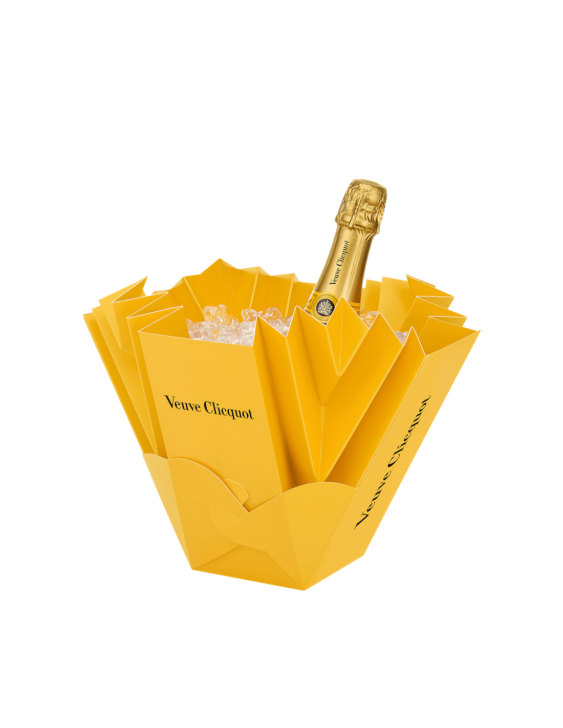 Grâce à son style origami unique, la boîte se déploie intelligemment pour se transformer en un seau à glace géométrique pouvant être réutilisé 10 fois avant d’être recyclé. Elle est fabriquée à partir de carton certifié FSC, recouvert à l’intérieur par une couche étanche composée de 70% de matériaux recyclés. *Seau Clicquot