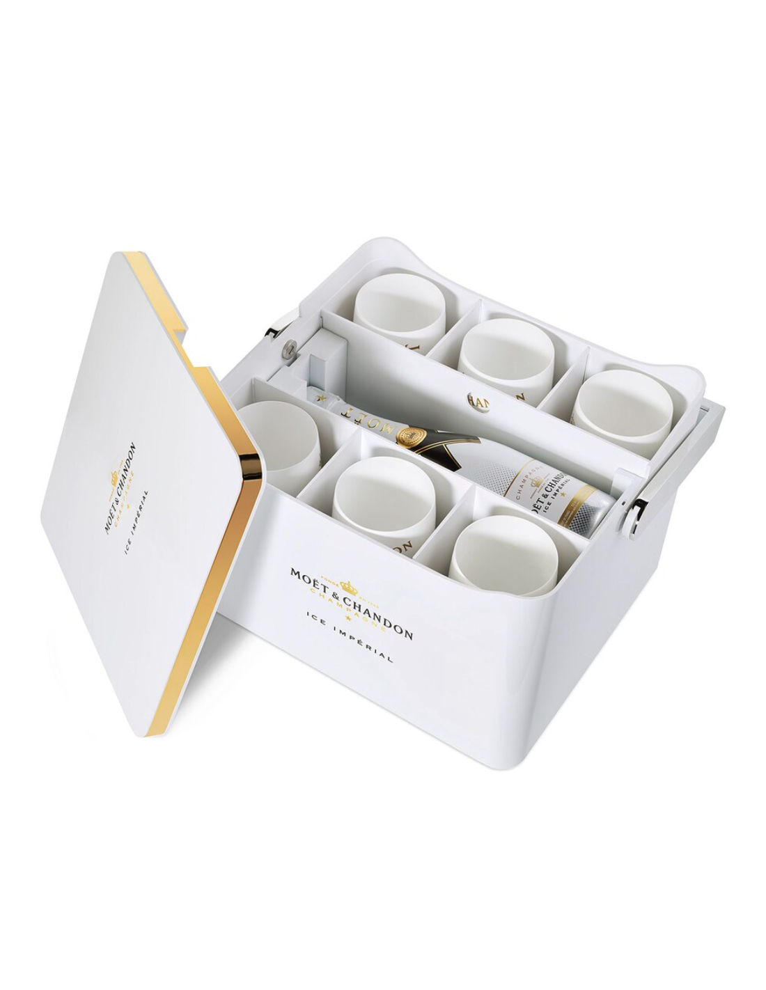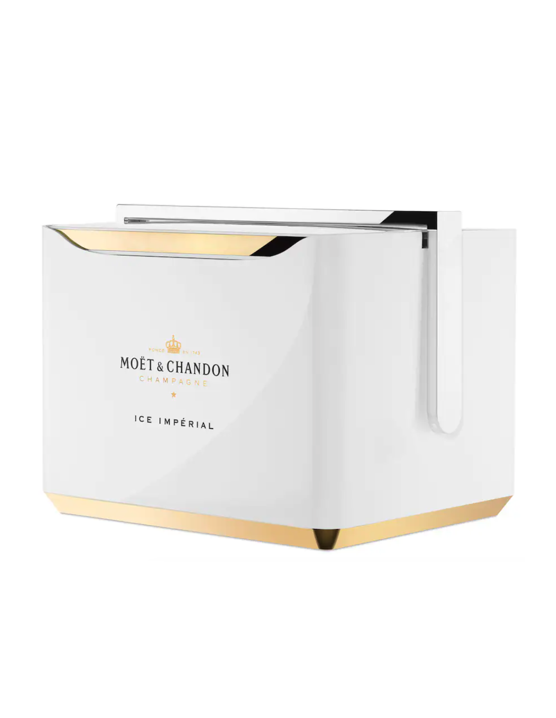 Partagez l'amour du champagne Moët & Chandon Ice Impérial : emportez cette élégante glacière blanche, ornée de détails dorés et argentés et de l'emblème de la maison, lors de votre prochaine fête estivale.