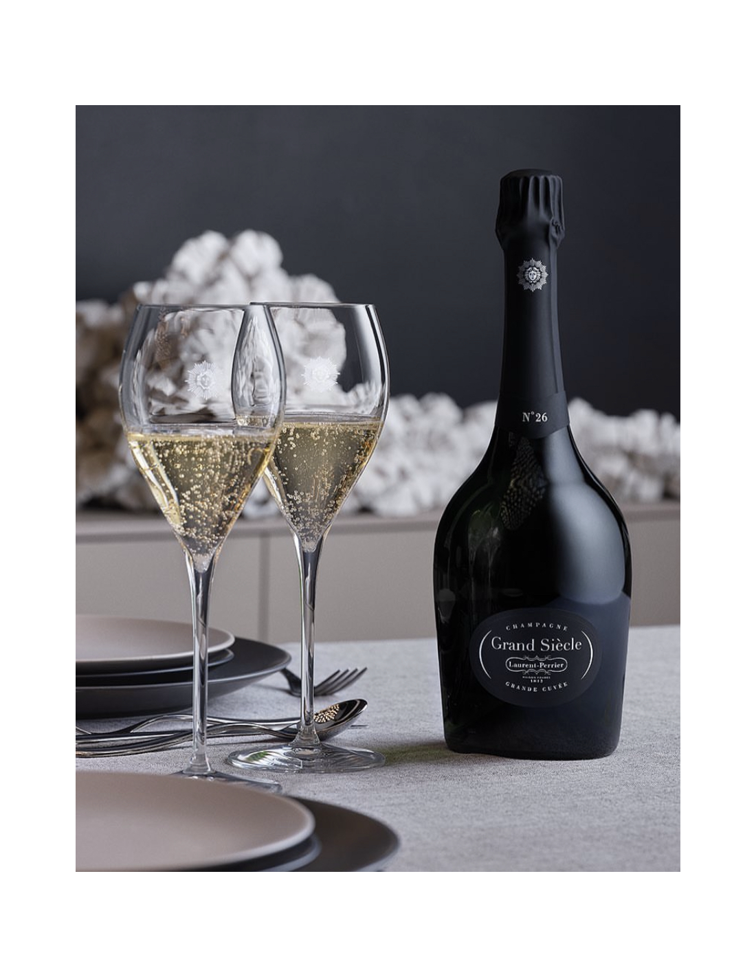 Coffret Deluxe Grand Siècle 2 verres Grand siècle avec logo sur verre et sur pied & 1 bouteille 75 cl Grand Siècle itération 26. Recréer l’année parfaite