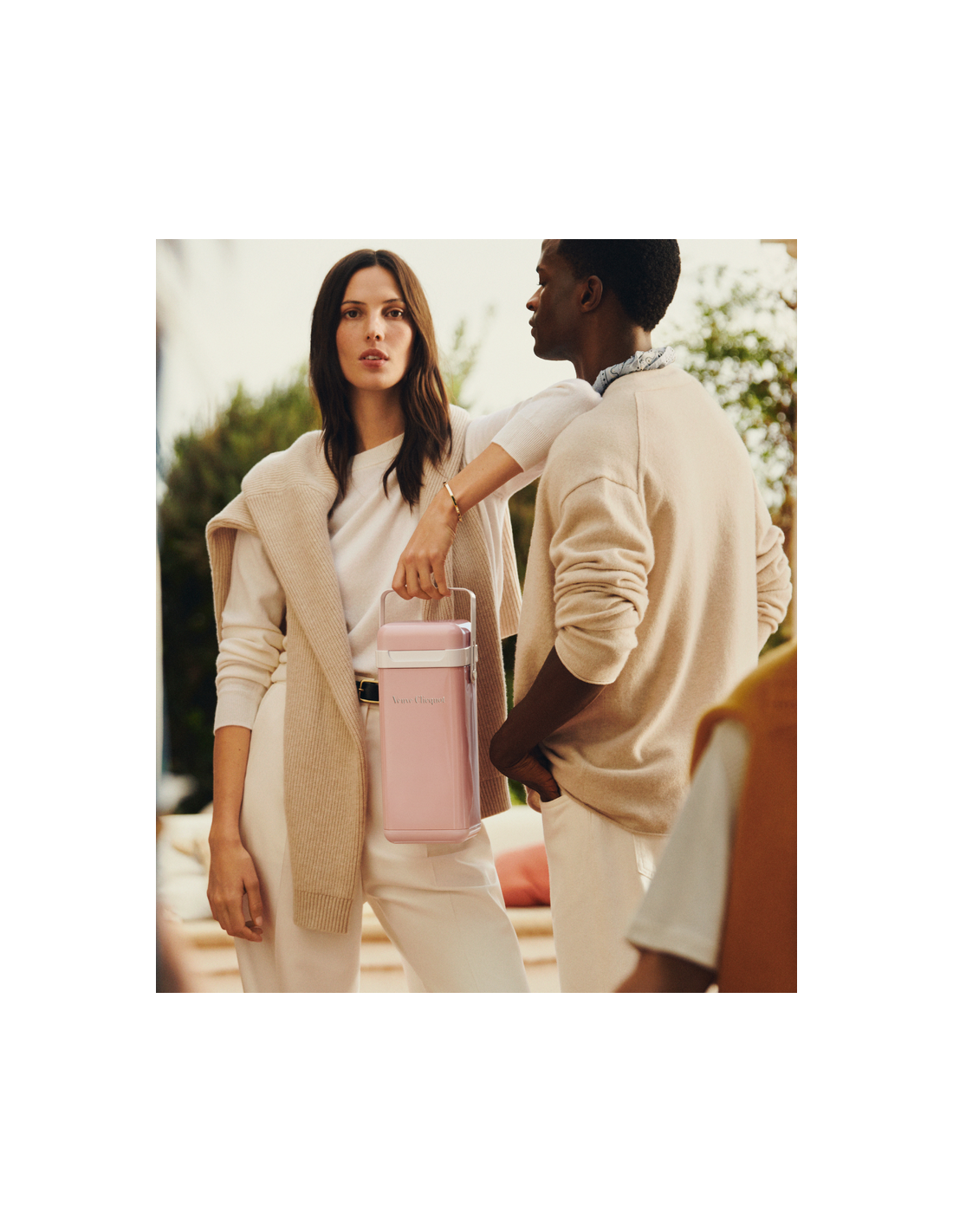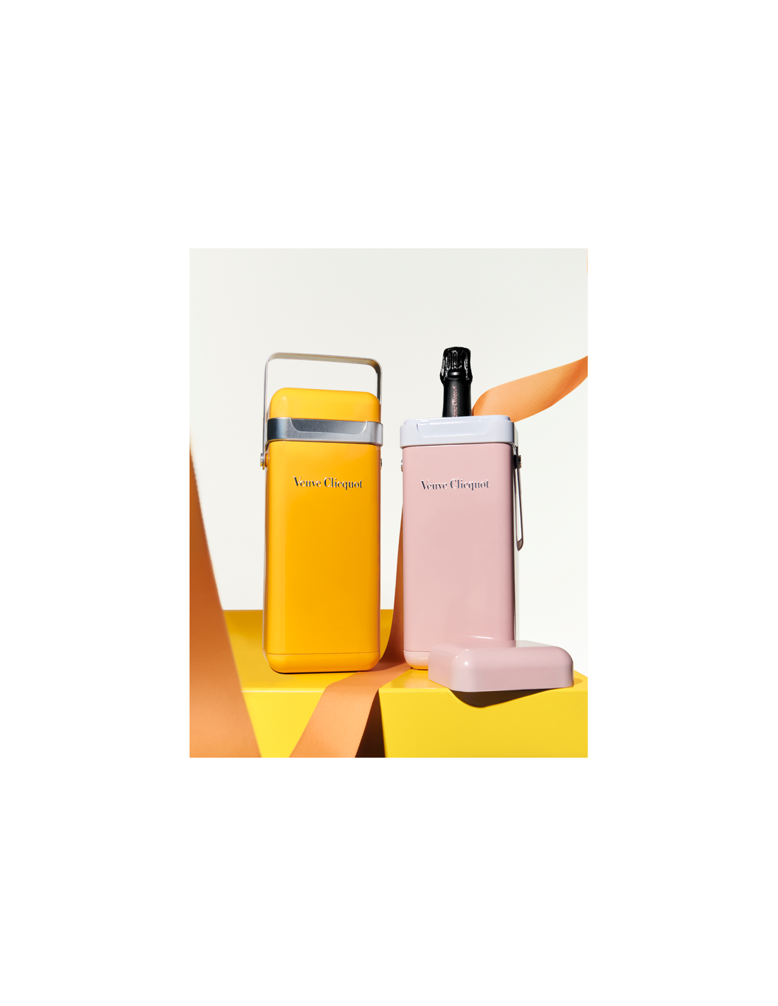 Ce nouvel objet, développé spécialement pour les pique-niques, est facilement transportable grâce à sa poignée en chrome et garde le champagne à bonne température jusqu’à une heure. Elle est proposée en deux coloris au choix – rose ou jaune – pour rappeler les étiquettes de ses champagnes Brut et Rosé.