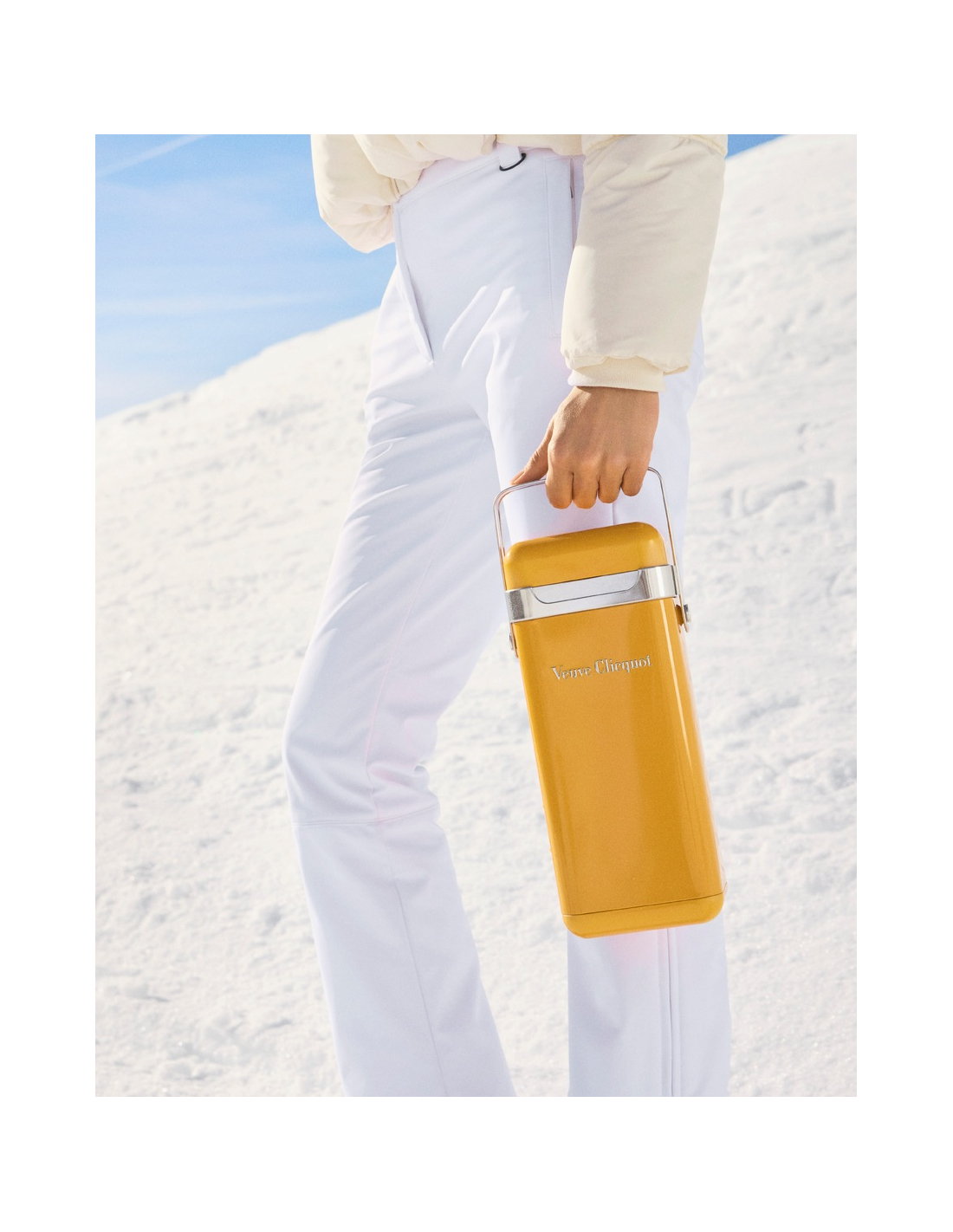 Conçu spécialement pour transporter une bouteille de Yellow Label ou de Rosé, ce nouvel objet fonctionnel peut être porté en bandoulière ou à l’épaule. Nomade mais également pratique, il conserve le champagne à température idéale pendant une heure, un essentiel pour un pique-nique.