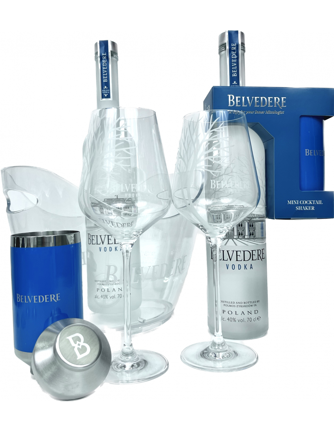 Belvedere Vodka Set 2 Medium Ice Bucket & 6 Spritz Glasses & 2 bottles Pure & 2 Mini Shaker - 40% - 2 x 70 CL