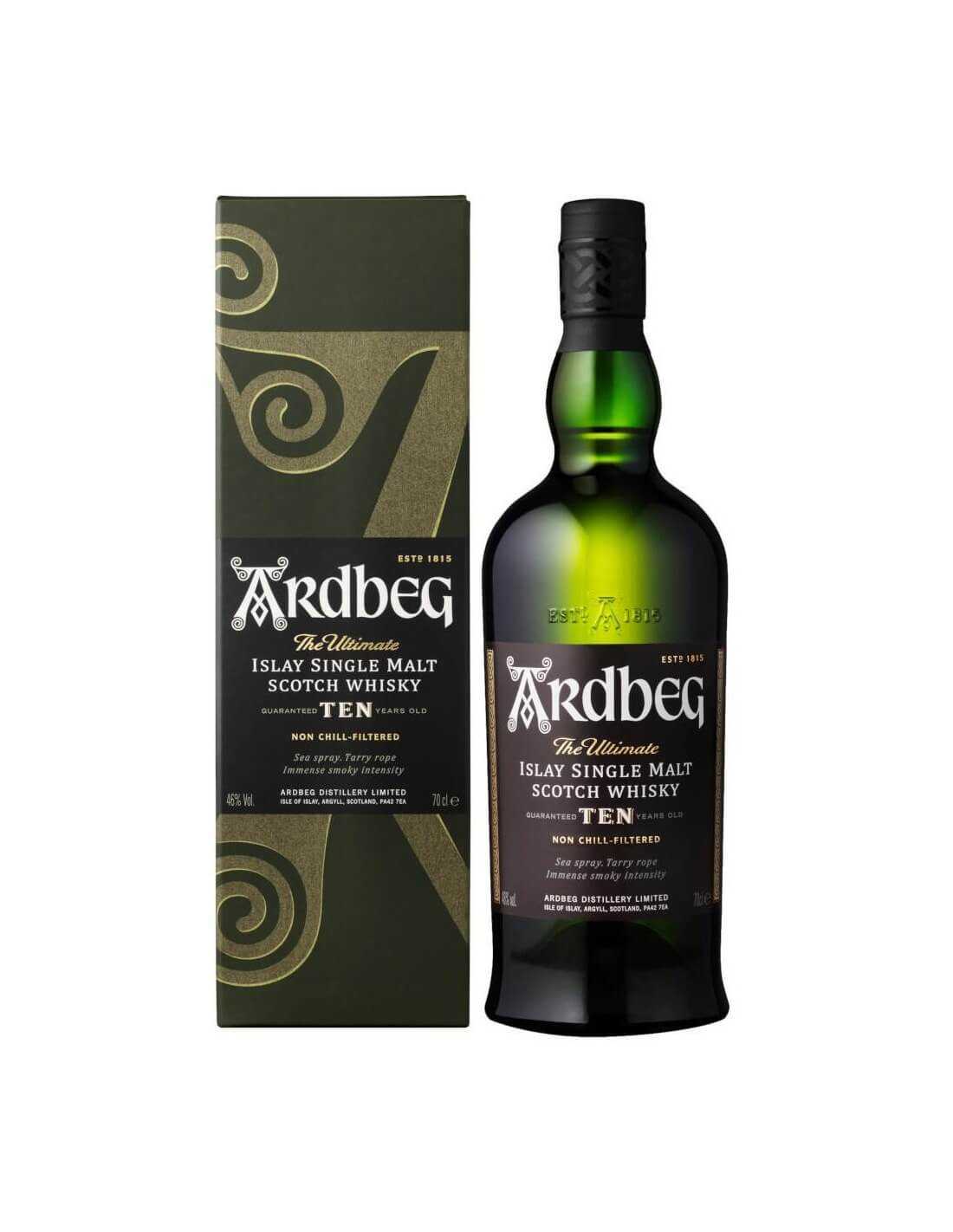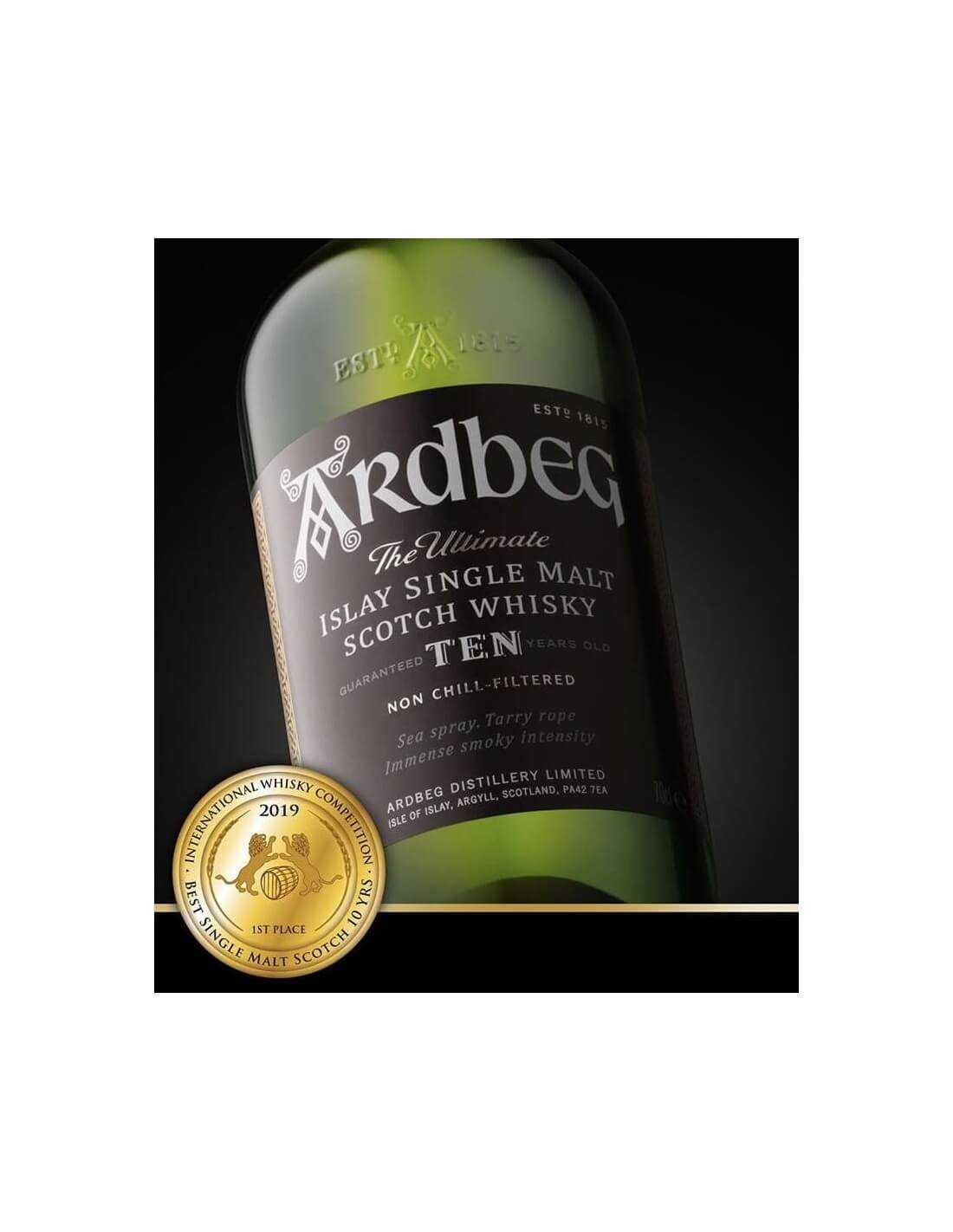 Ardbeg Ten Years Old représente l’essence même de la gamme Ardbeg.Il a été nommé en 2008 meilleur whisky de l’année dans la Bible du Whisky de Jim Murray. Couleur ambrée claire, avec des reflets dorés et brillants. Le nez explose littéralement d'arômes intenses de fumée, de fruit et de tourbe qui évoluent vers des notes vives de citron vert et jaune enveloppées d’une senteur de chocolat noir fondant. La douceur initiale est rapidement suivie par une bouffée de notes de tourbe, associée au tabac et au café serré. Viennent ensuite des notes de mélasse et de réglisse. Légèrement épicé au premier abord, il devient alléchant puis rond en bouche. Longue finale sur des arômes fumés avec des nuances de graines d’anis et d’amandes grillées puis une légère saveur de poire