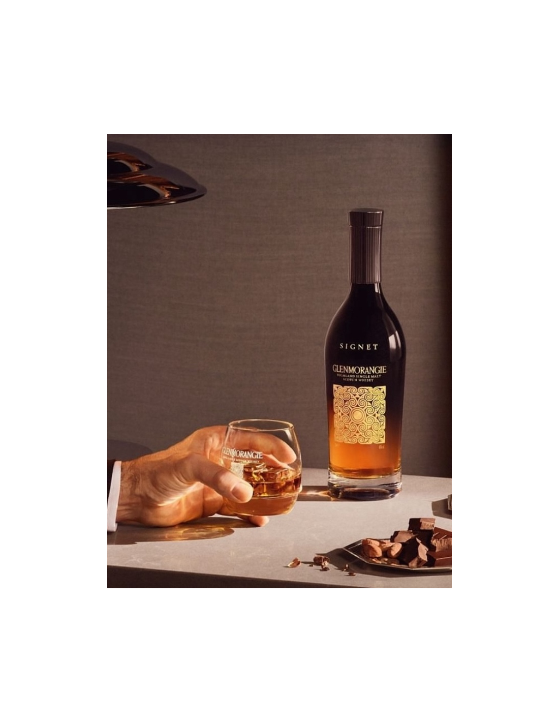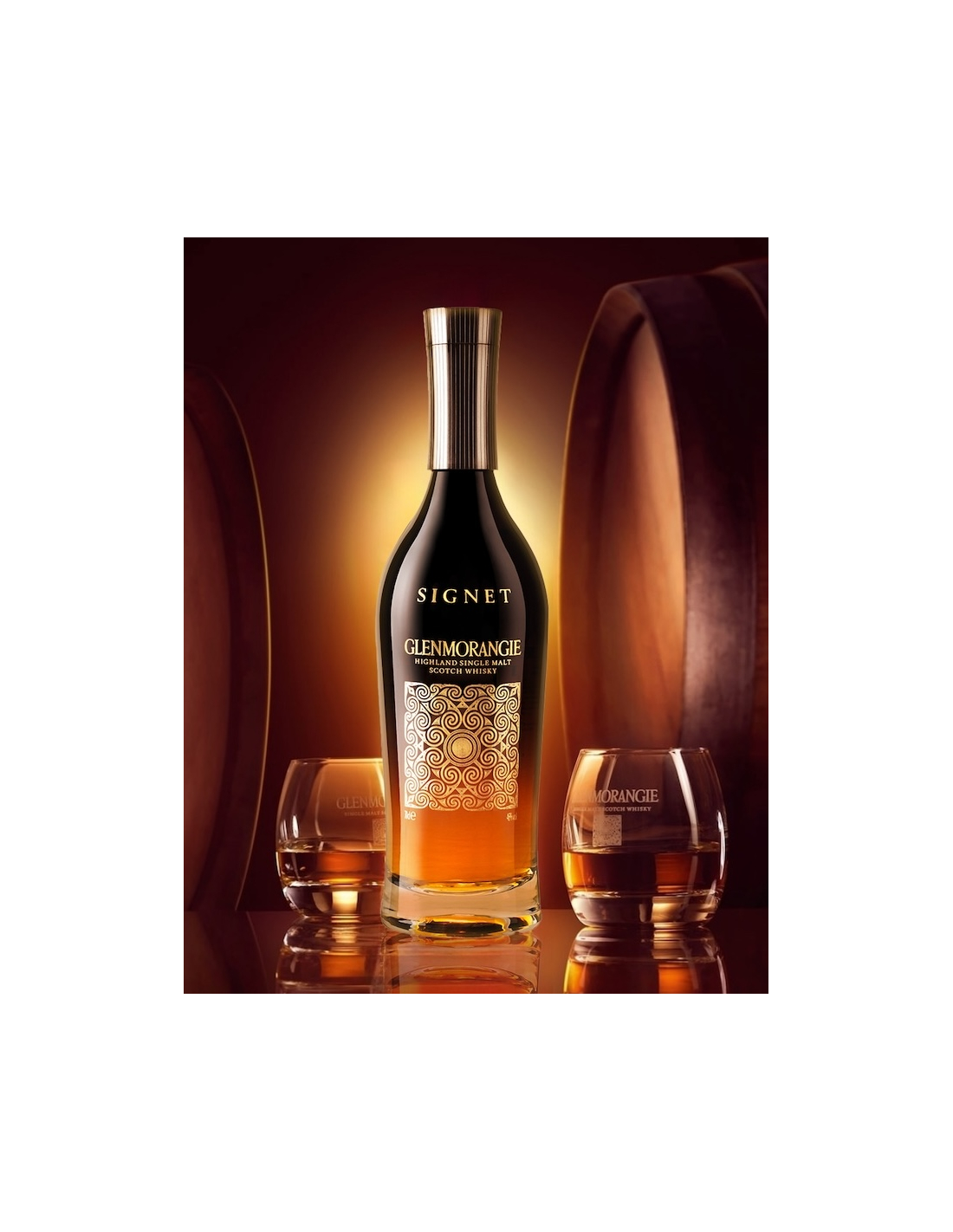 Bien que la recette exacte soit mystérieuse, Signet contient les plus anciens whiskies Glenmorangie. Son arôme unique provient d'un "malt au chocolat" torréfié noir et d'un vieillissement en barriques sur mesure.