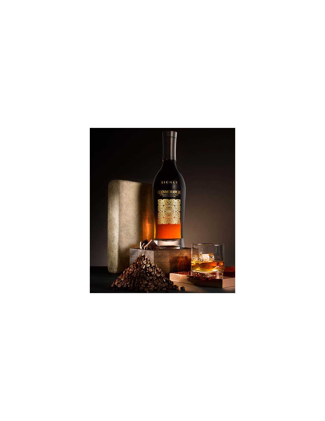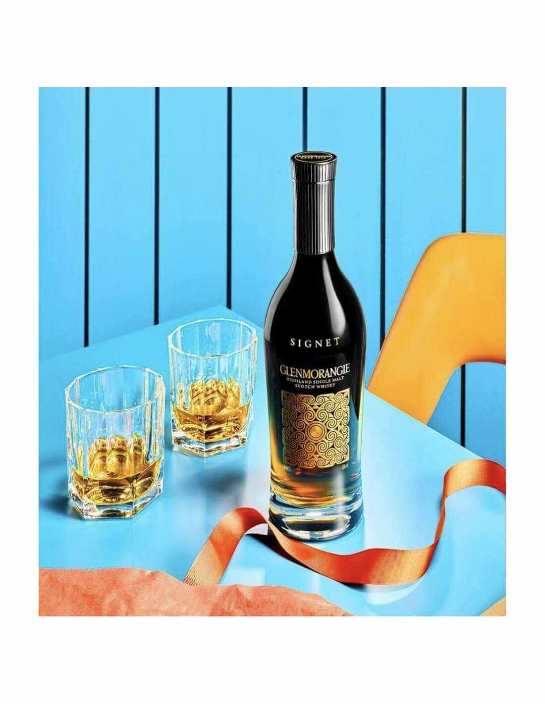 Bien que la recette exacte soit mystérieuse, Signet contient les plus anciens whiskies Glenmorangie. Son arôme unique provient d'un "malt au chocolat" torréfié noir et d'un vieillissement en barriques sur mesure.